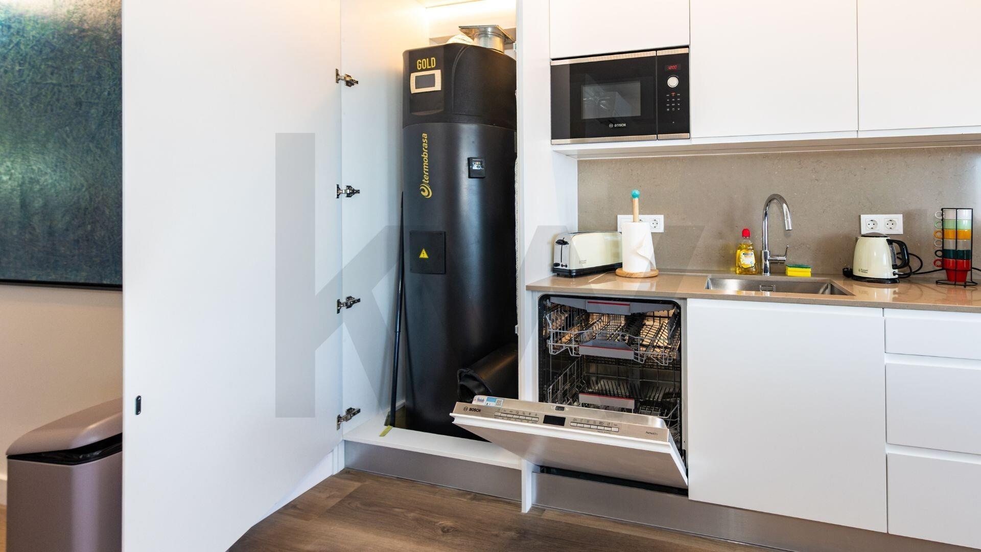 🏡 Apartamento T3 vendido totalmente mobilado, com design contemporâneo, móveis sob medida de Portugal e da Holanda, e eletrodomésticos topo de gama.