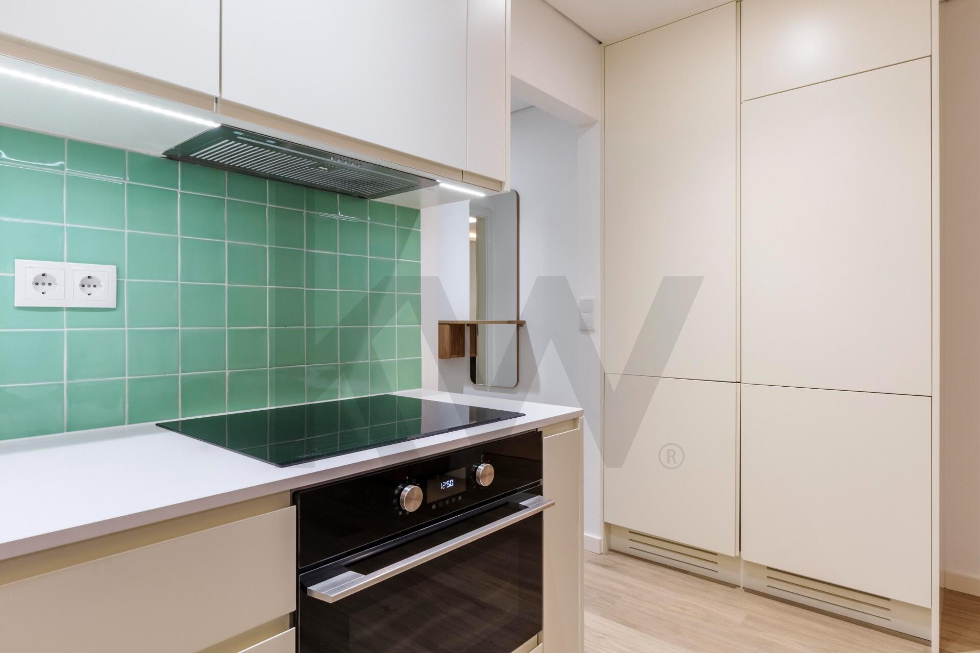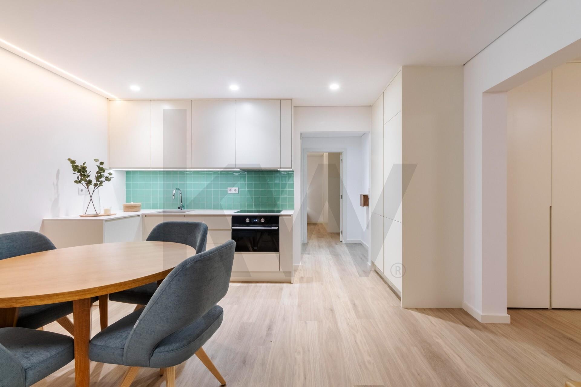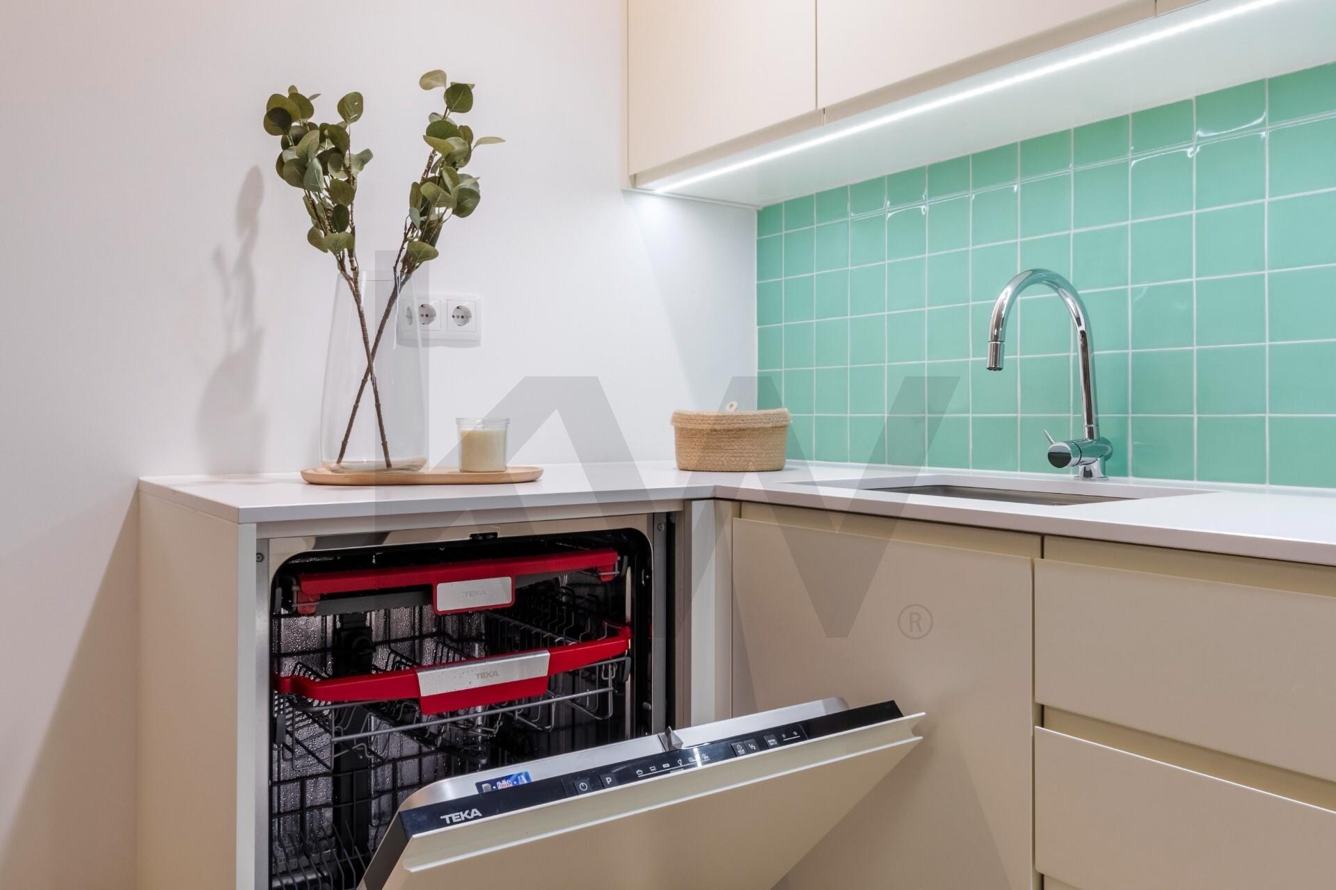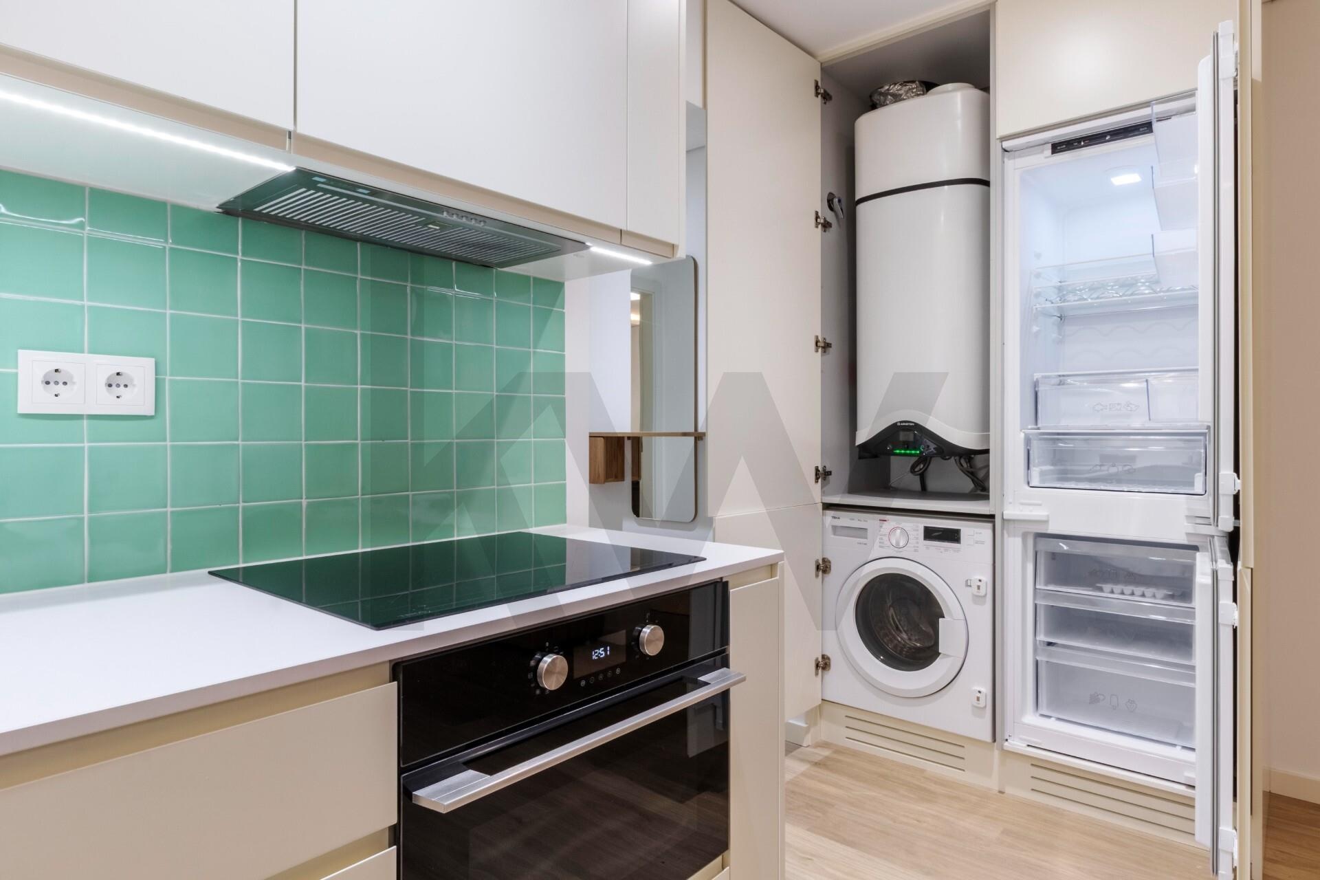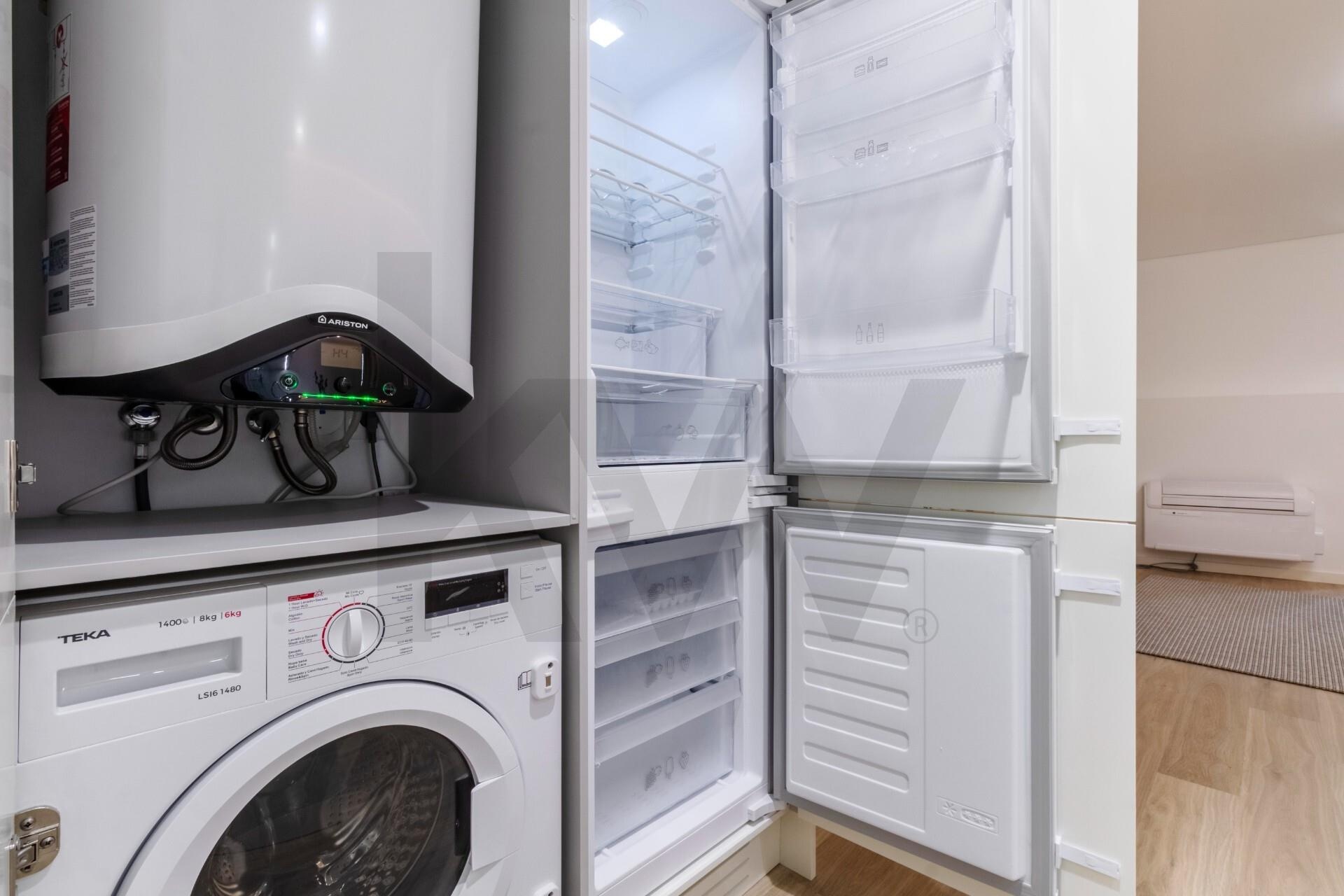 A cozinha está totalmente equipada com eletrodomésticos da marca TEKA (placa de indução, forno, frigorífico, máquina de lavar loiça e máquina de lavar/secar roupa) e o apartamento dispõe de ar condicionado, assegurando praticidade e conforto em todas as estações do ano.