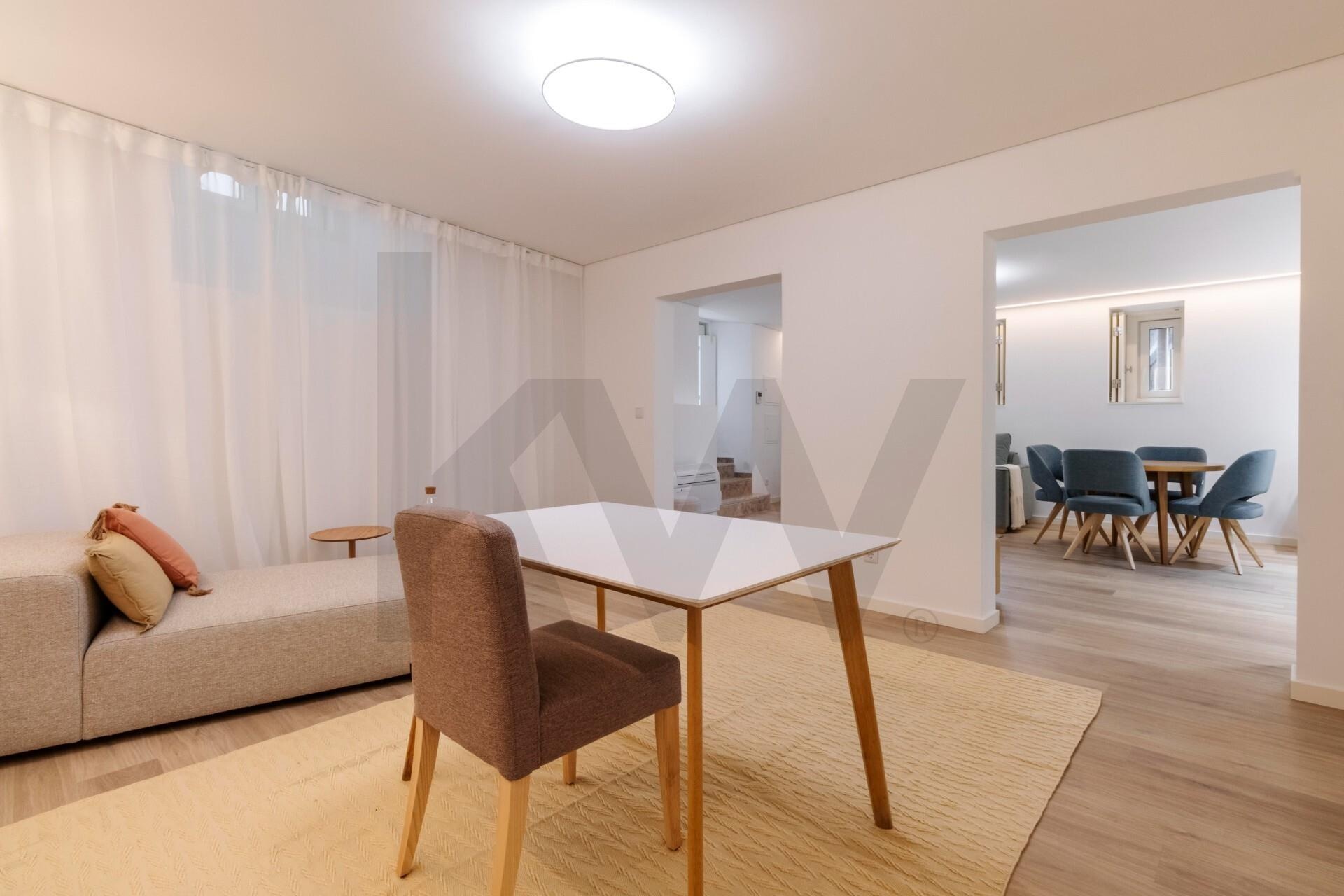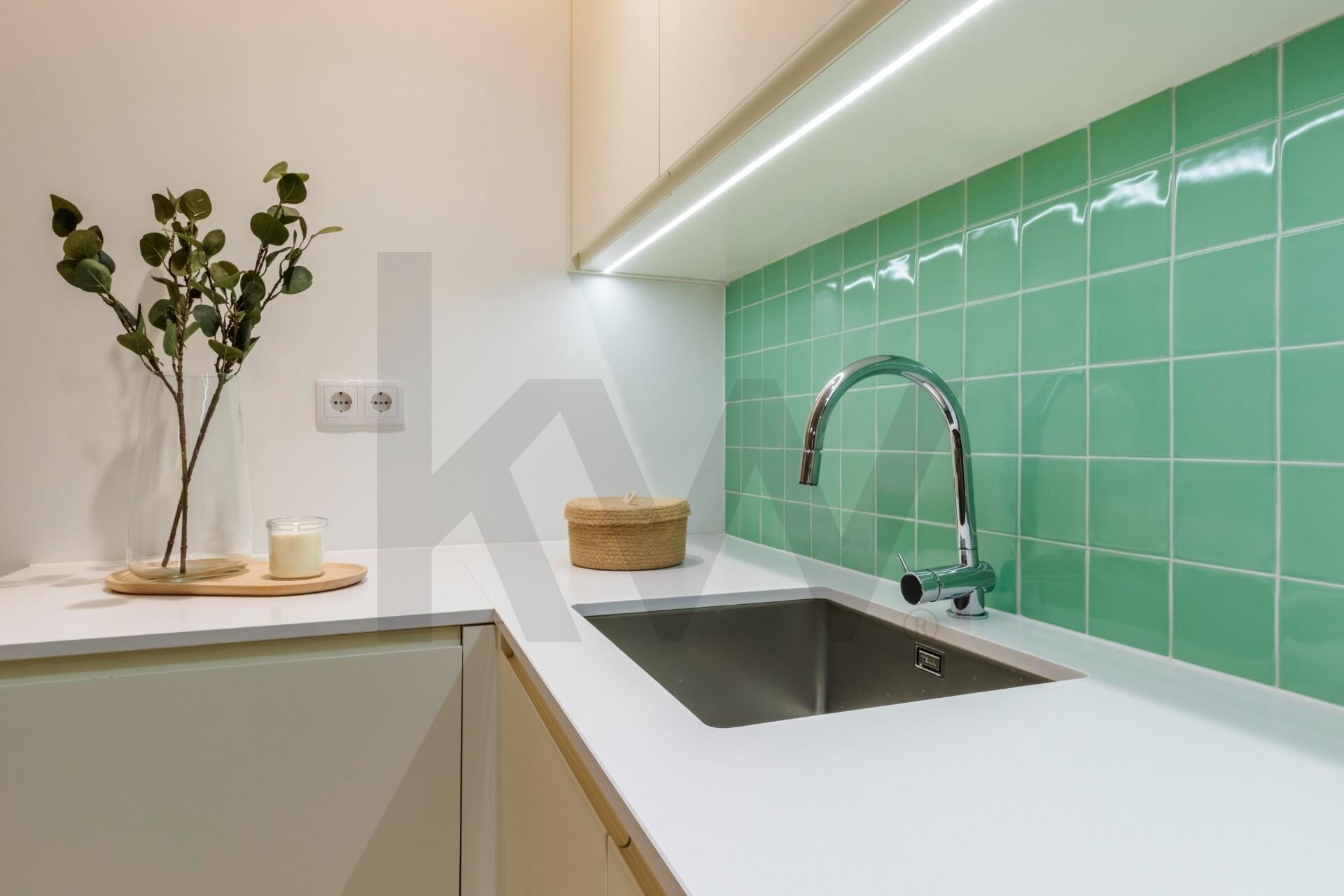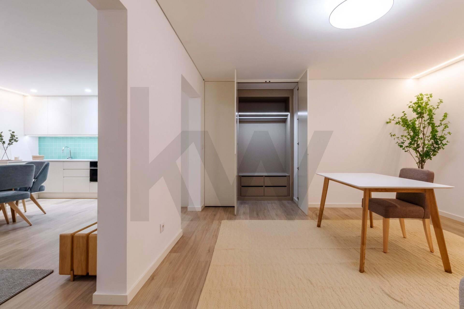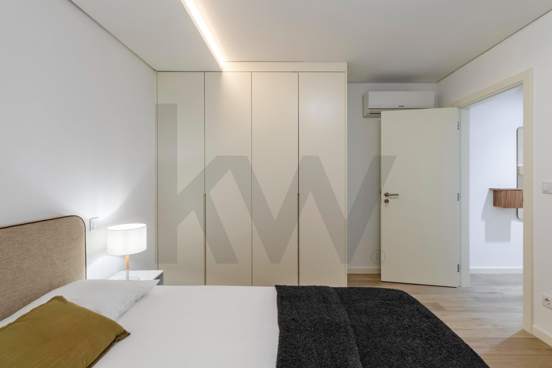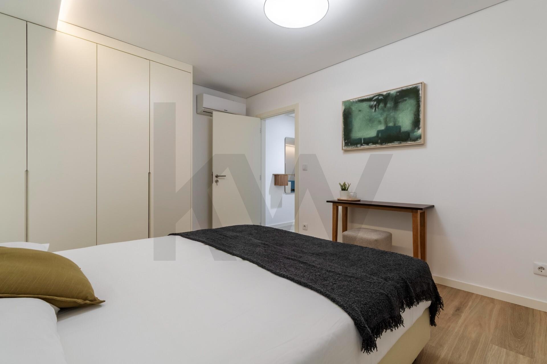 A cozinha está totalmente equipada com eletrodomésticos da marca TEKA (placa de indução, forno, frigorífico, máquina de lavar loiça e máquina de lavar/secar roupa) e o apartamento dispõe de ar condicionado, assegurando praticidade e conforto em todas as estações do ano.