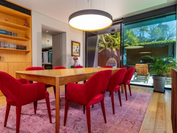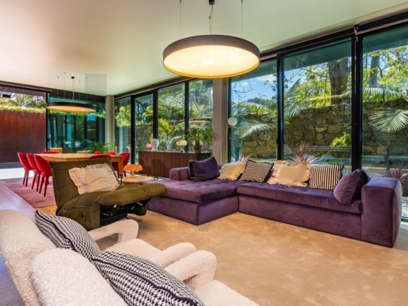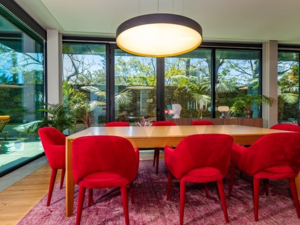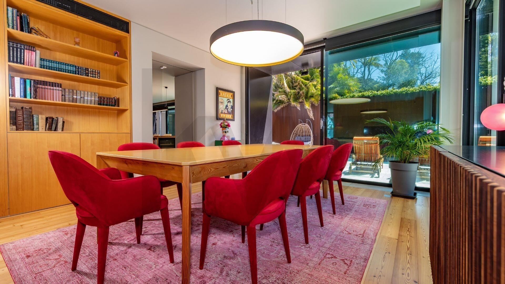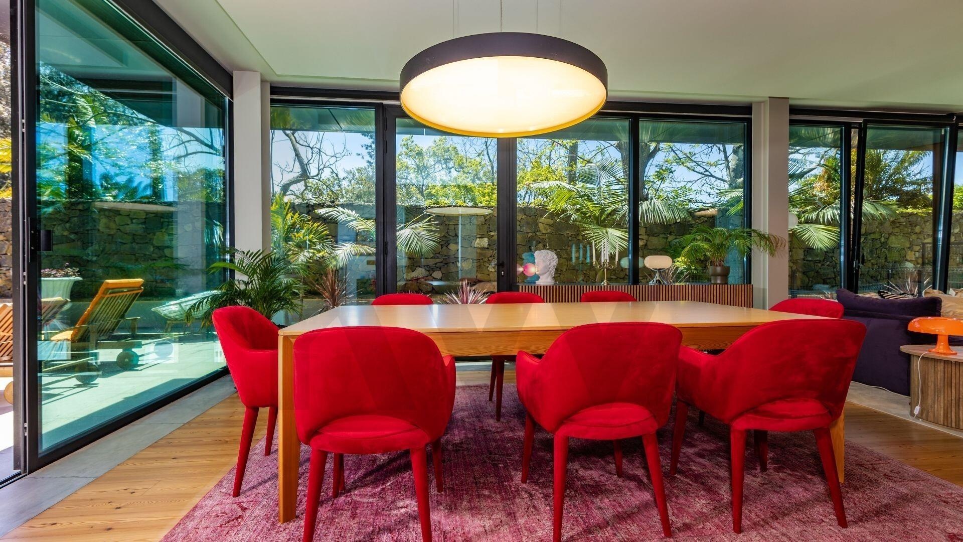 A sala é ampla, com grandes envidraçados que proporcionam uma luminosidade única e acesso direto à zona exterior e à piscina aquecida, criando um ambiente perfeito para relaxar ou receber convidados. A área social integra-se harmoniosamente com o exterior, potenciando a vivência dos espaços verdes envolventes.