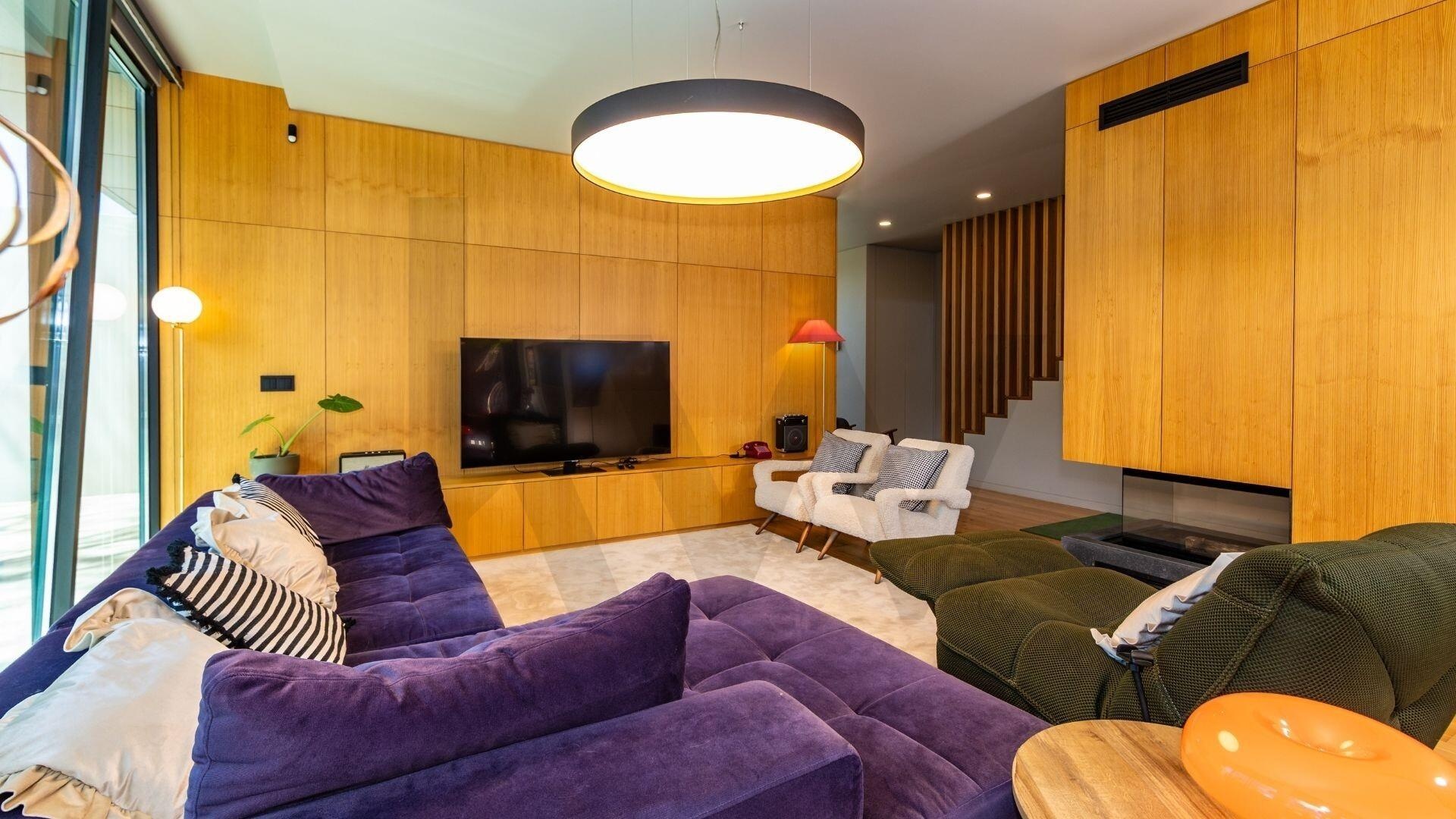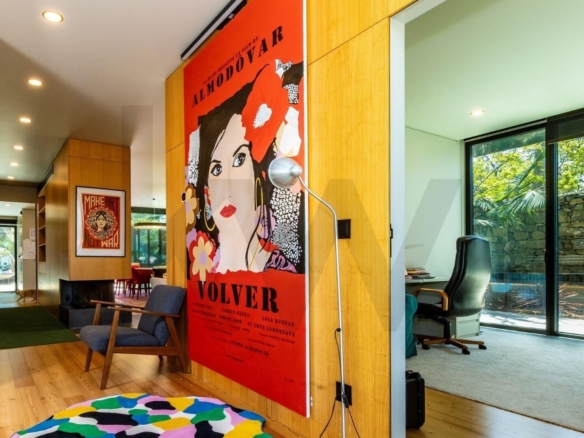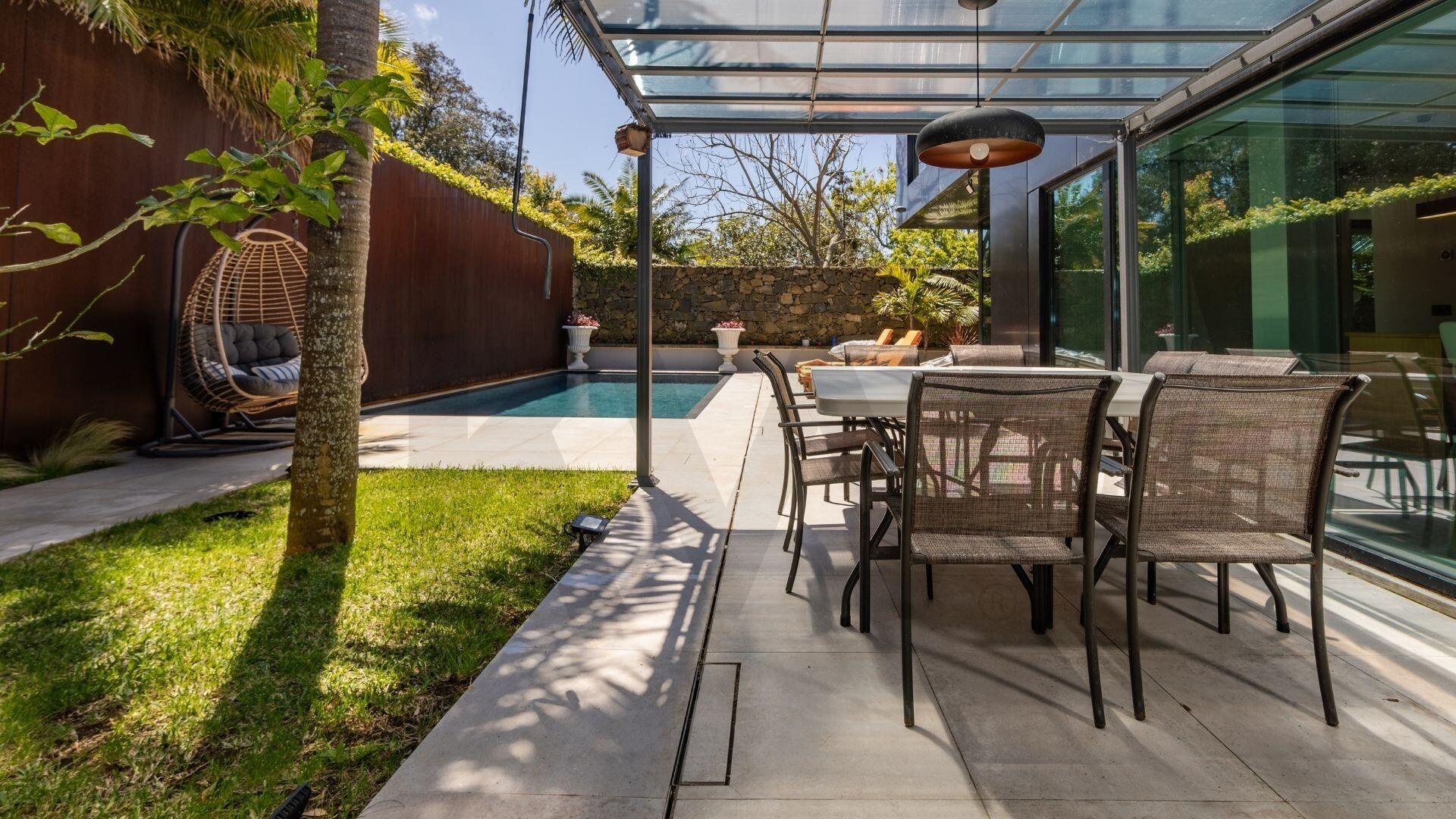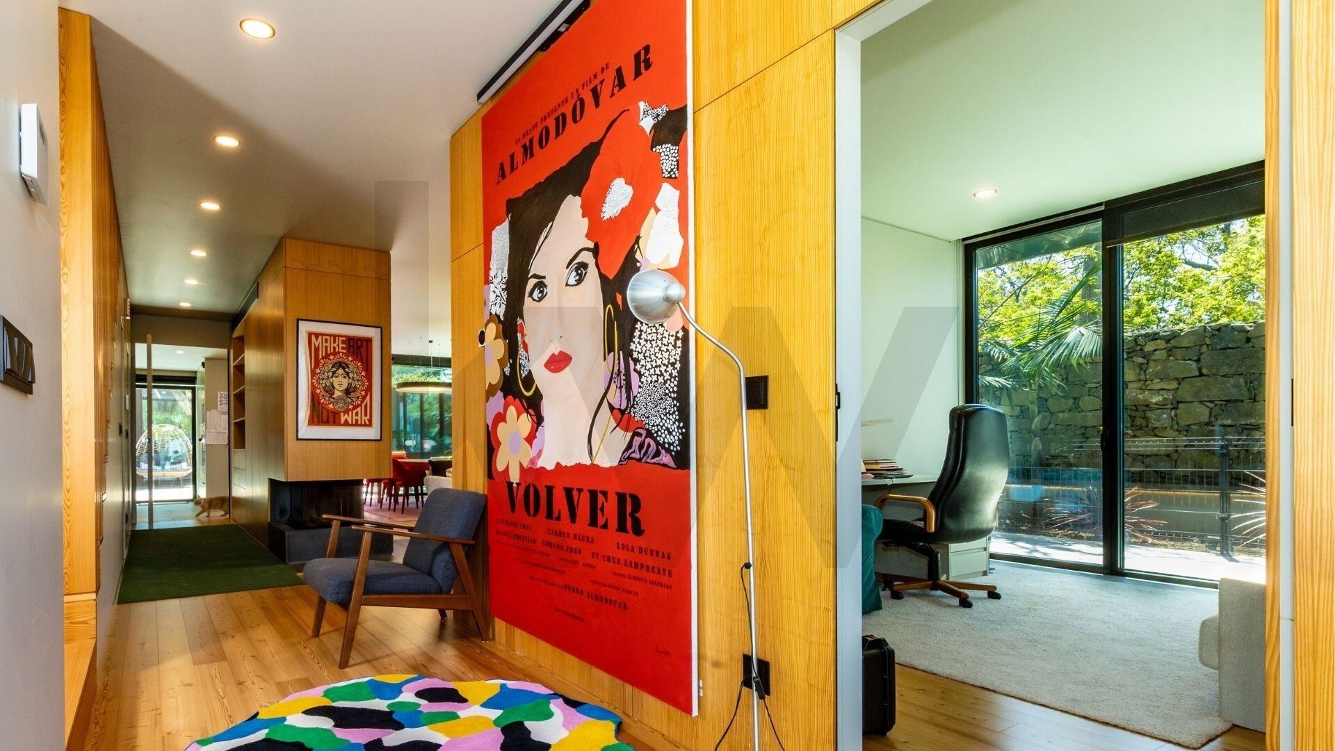 A sala é ampla, com grandes envidraçados que proporcionam uma luminosidade única e acesso direto à zona exterior e à piscina aquecida, criando um ambiente perfeito para relaxar ou receber convidados. A área social integra-se harmoniosamente com o exterior, potenciando a vivência dos espaços verdes envolventes.
