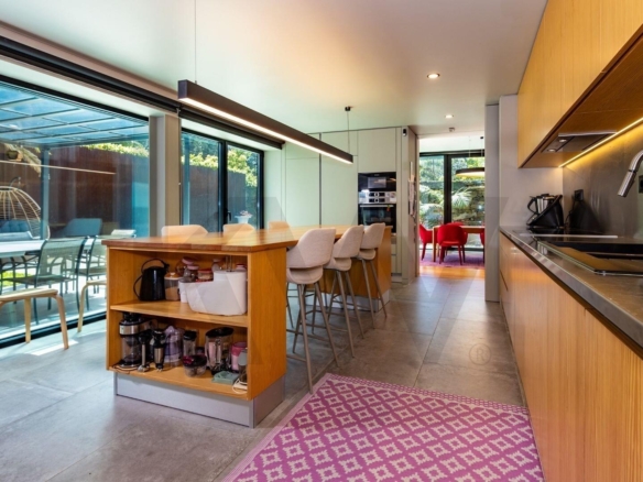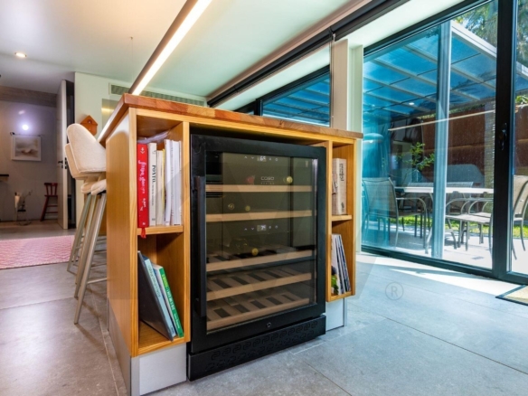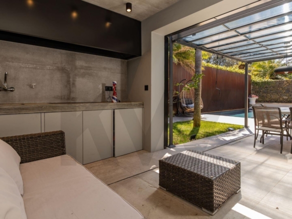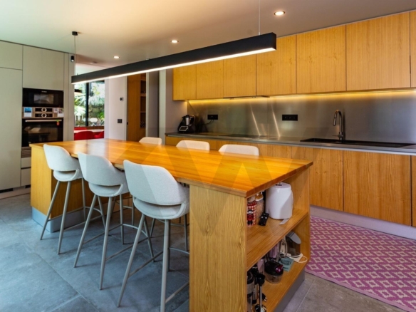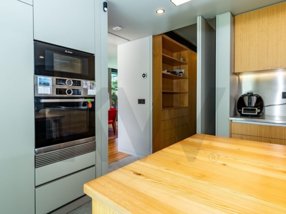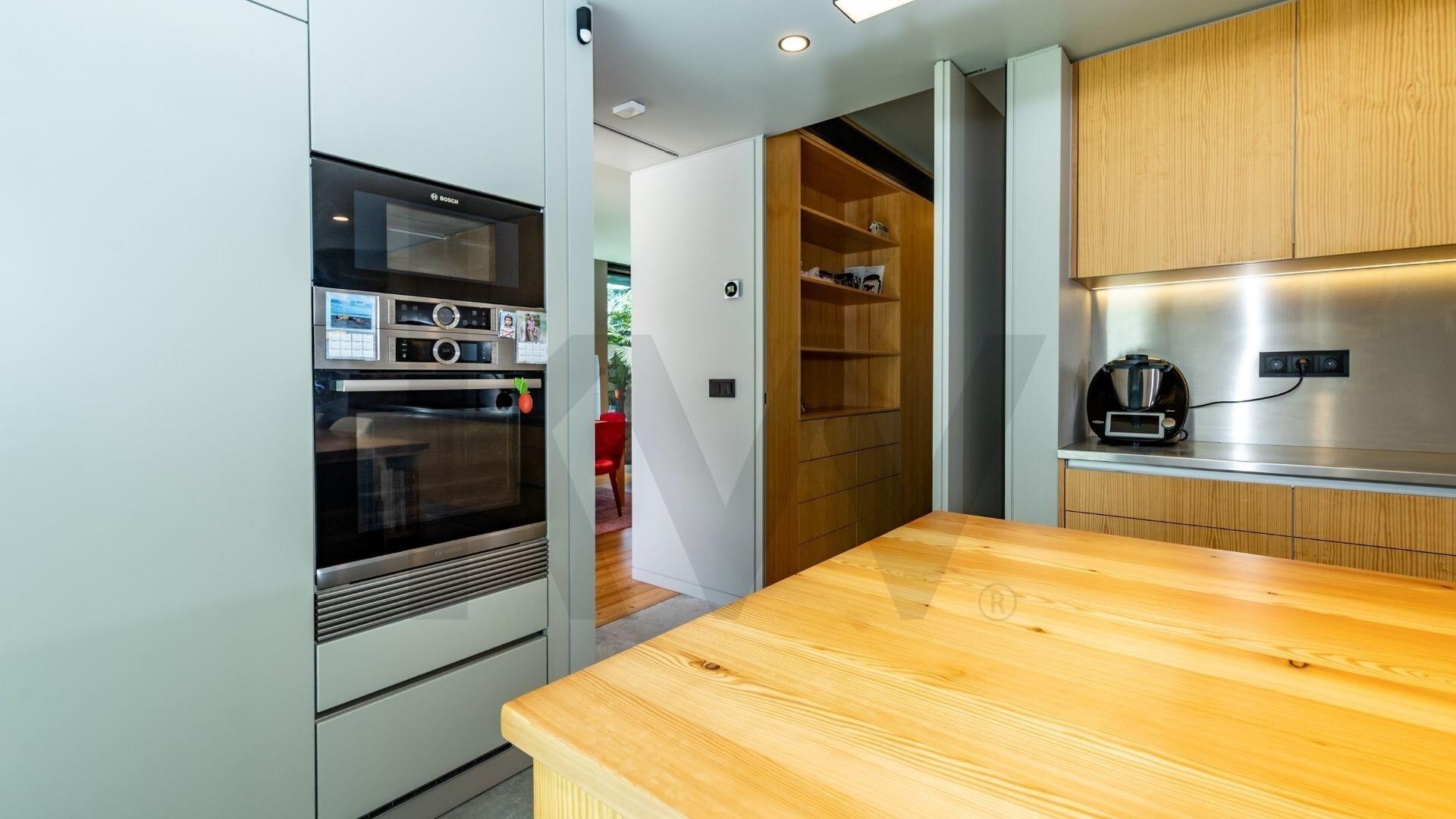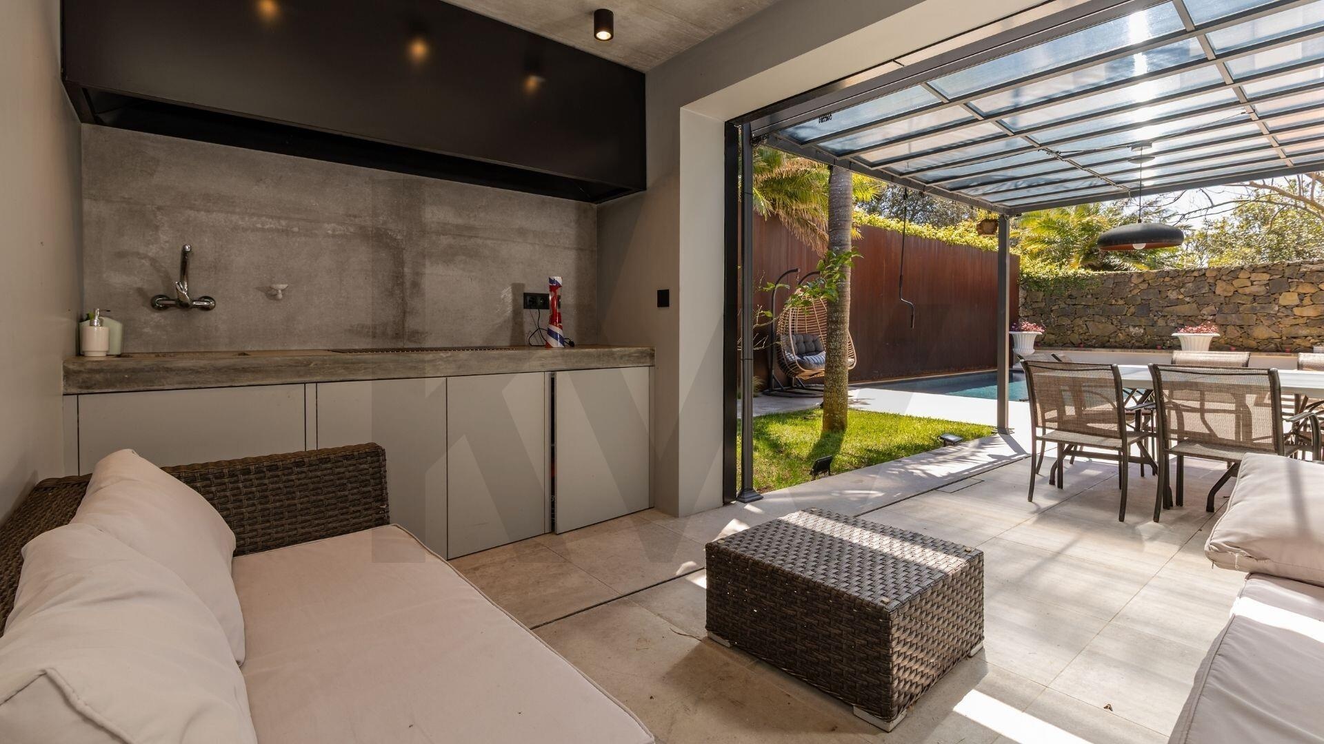 A cozinha moderna oferece acesso rápido à zona de barbecue, ideal para refeições ao ar livre e momentos de convívio junto à piscina.