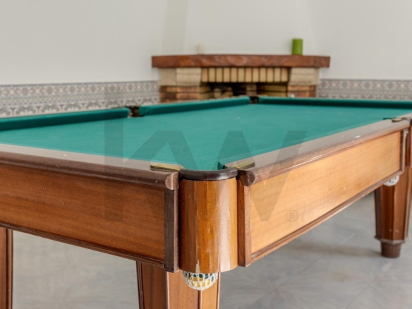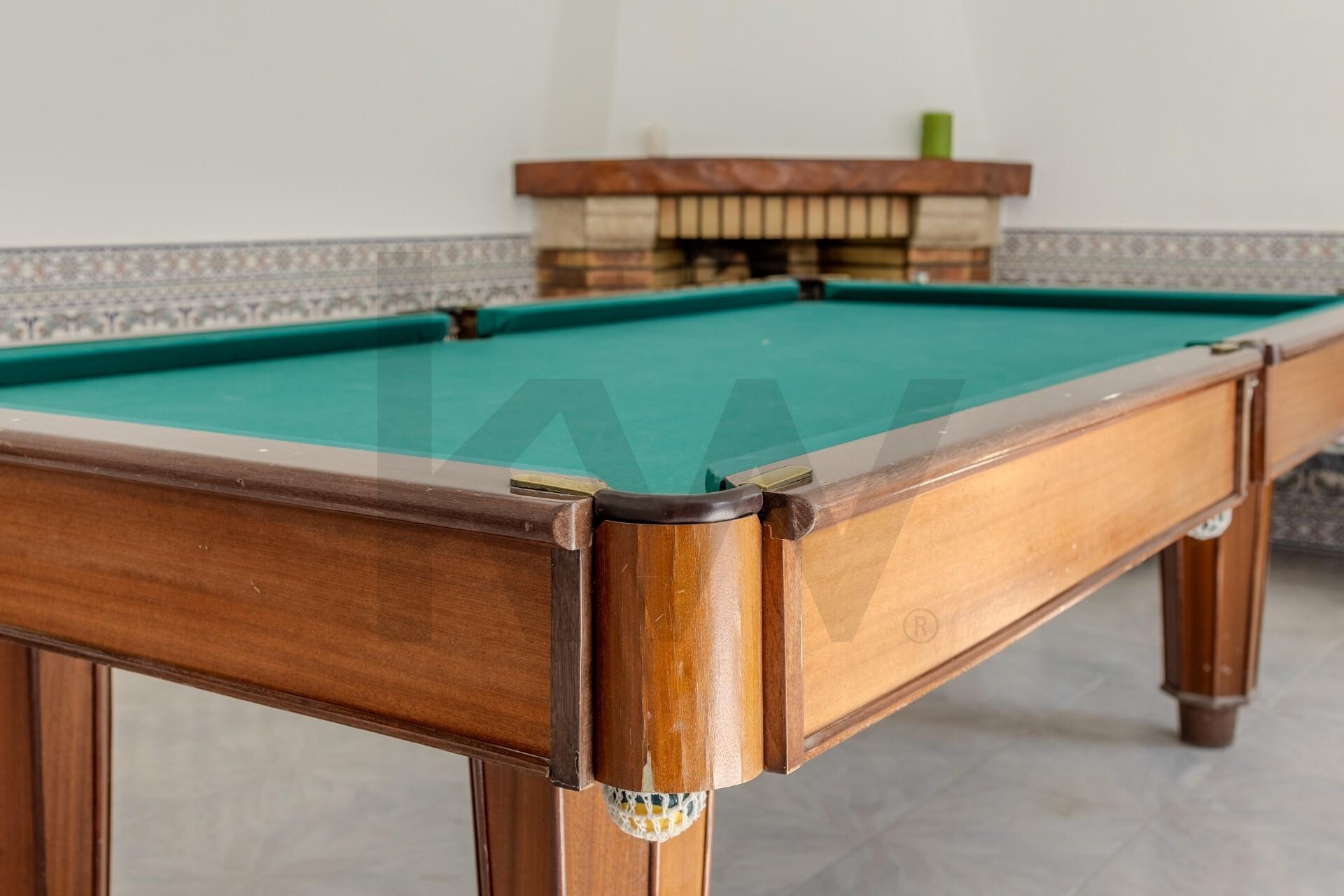 Sala de jogos em anexo com mesa de snooker e lareira, ideal para momentos de descontração e entretenimento