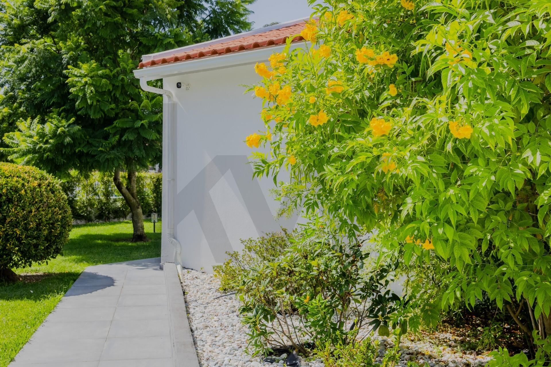 Jardim extraordinário, com zonas relvadas, vegetação cuidada e recantos para relaxar ou receber convidados. Zona de churrasco exterior, ideal para refeições ao ar livre e fins de semana em família. Diversos espaços de circulação e áreas de descanso, que convidam a usufruir do clima e da tranquilidade envolvente