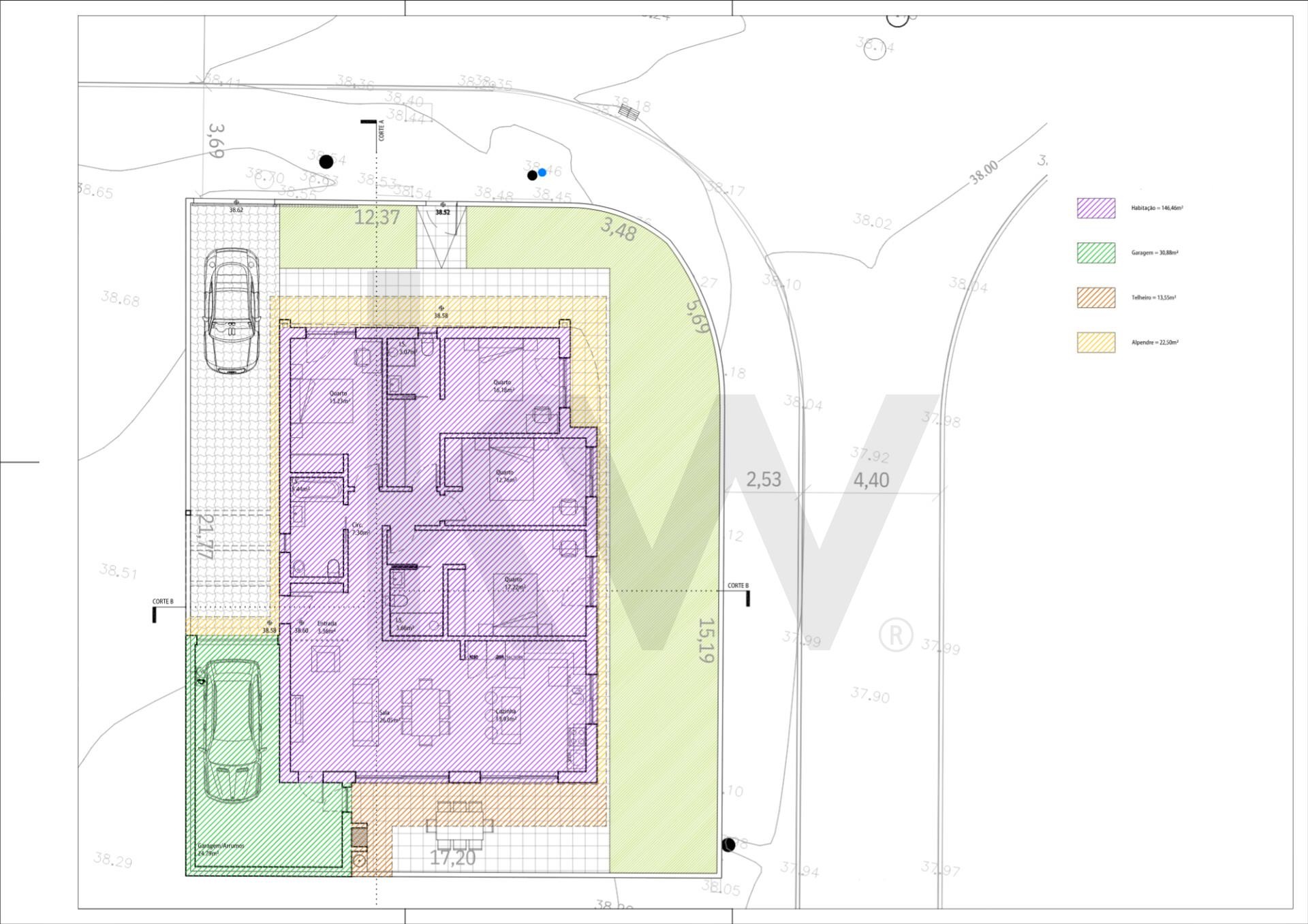 A moradia apresenta uma área bruta de construção de 146,21 m², complementada por garagem e arrumos com 30,24 m².