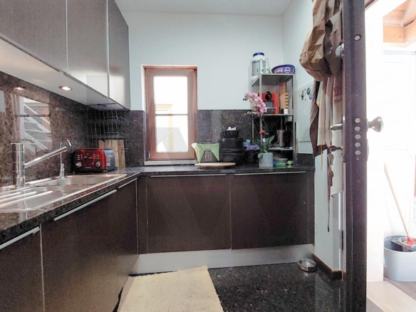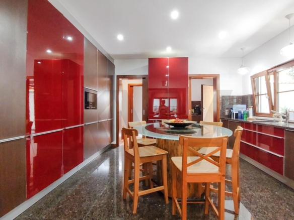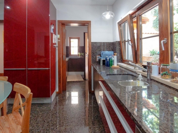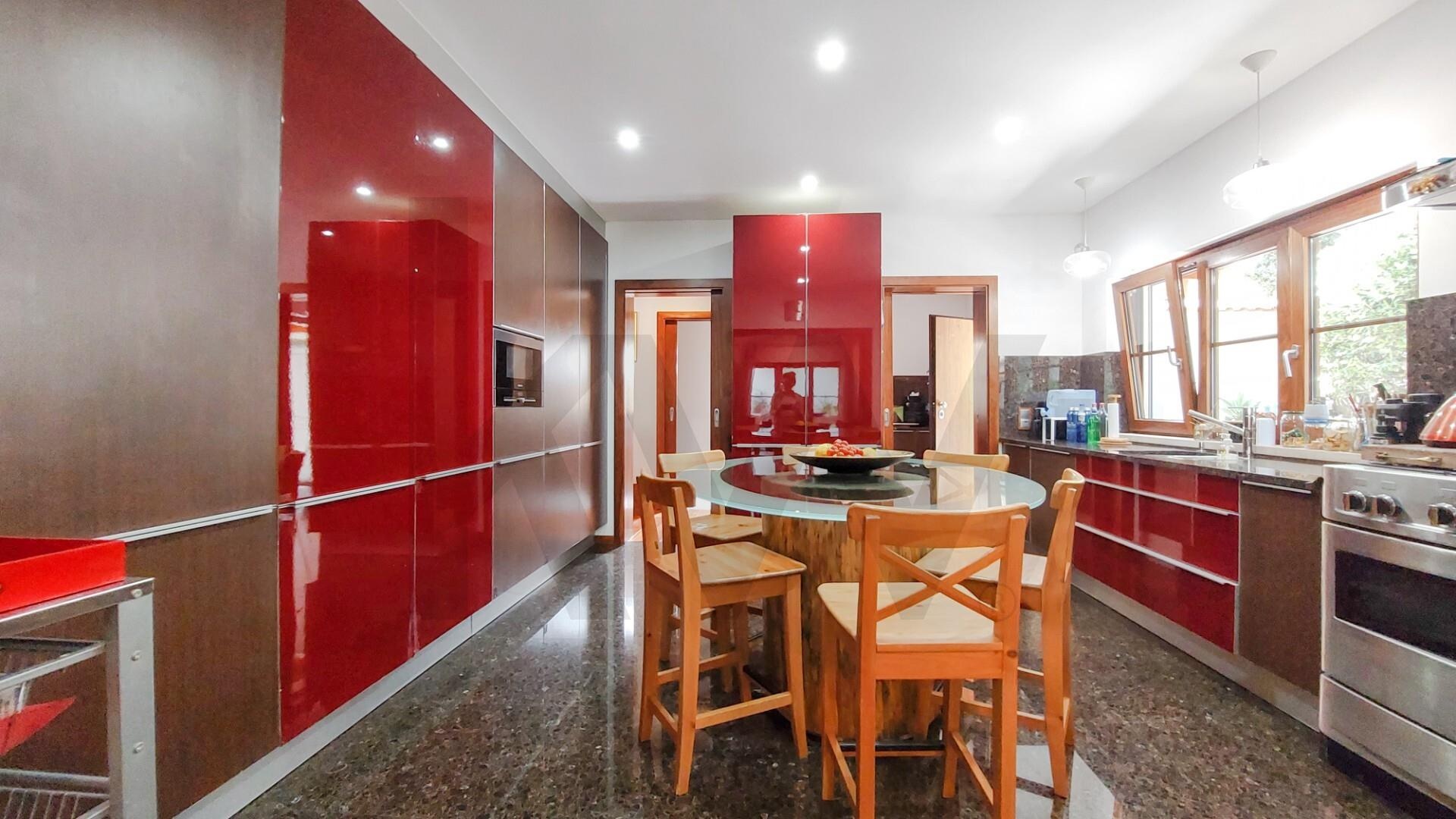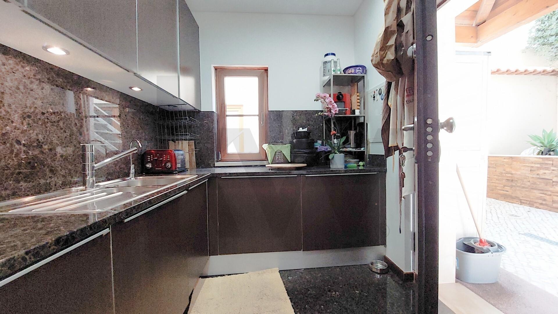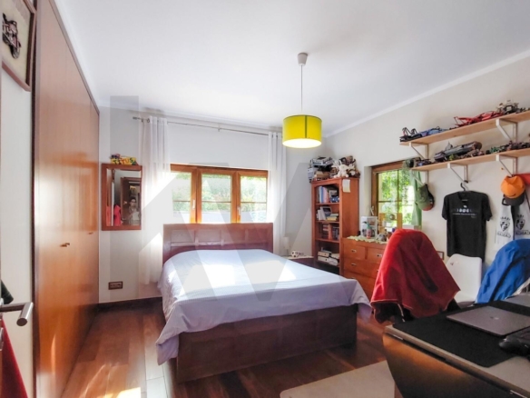 No piso principal, encontra uma ampla sala de estar e jantar aquecida por uma lareira acolhedora, complementada por uma cozinha principal totalmente equipada, banhada em luz natural através de grandes janelas panorâmicas. Para maior comodidade, existe ainda uma cozinha de apoio com acesso direto ao jardim traseiro e um WC social elegante.