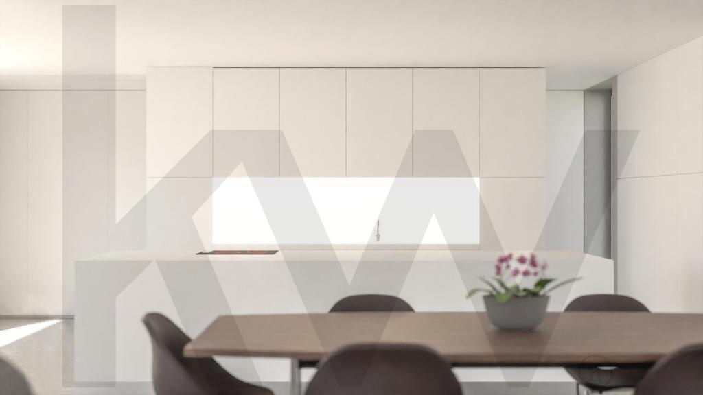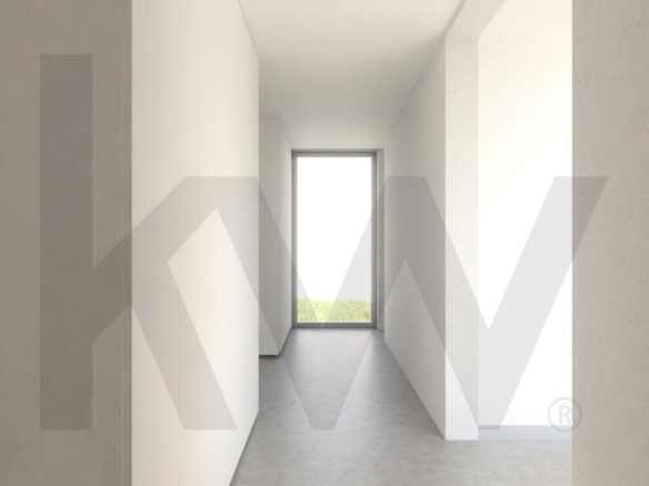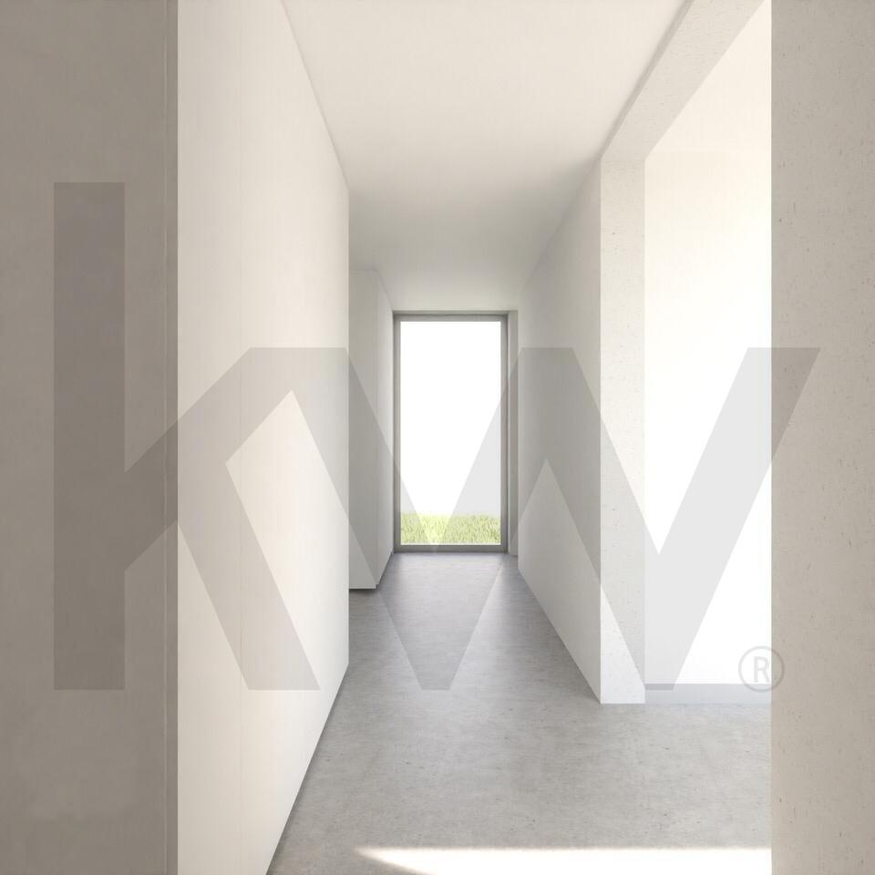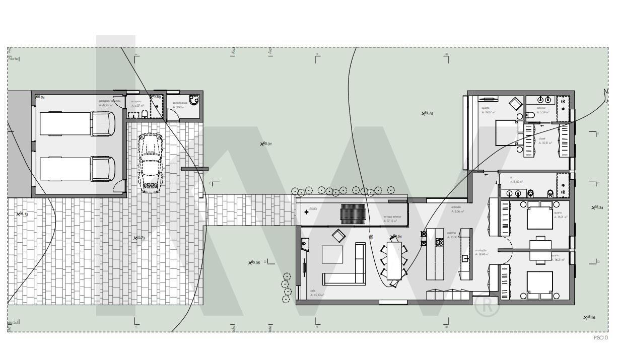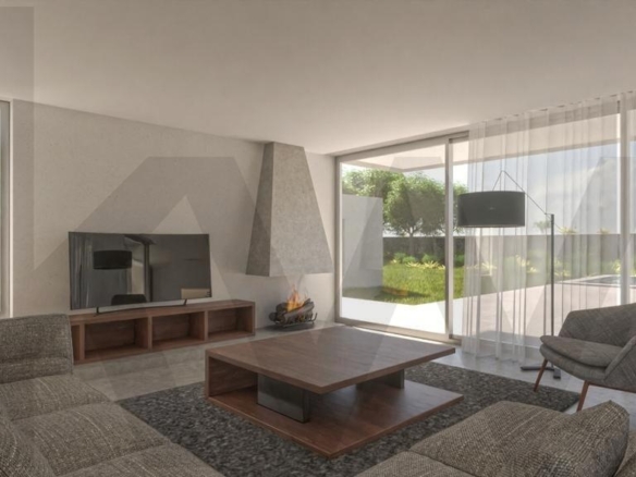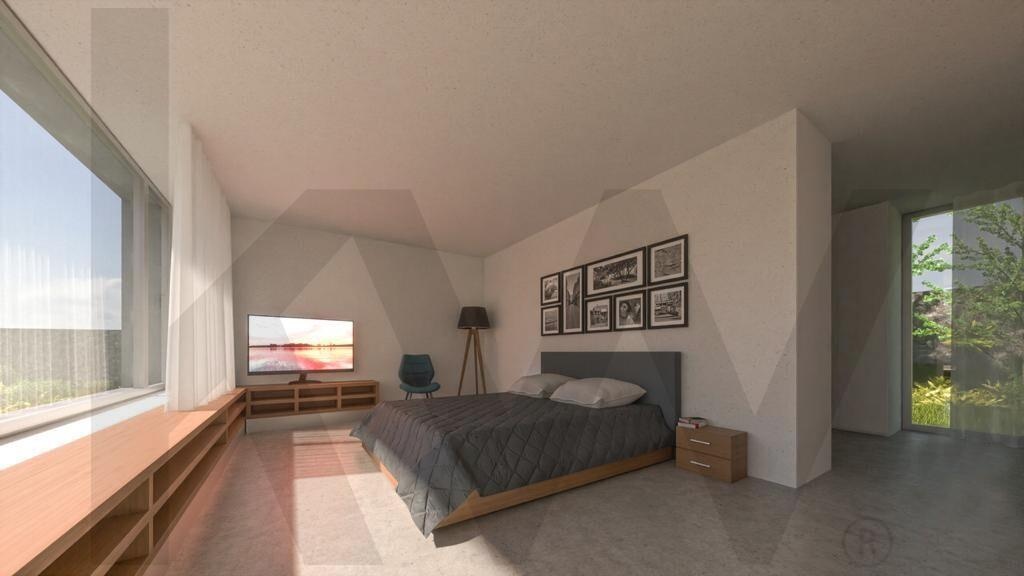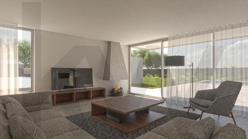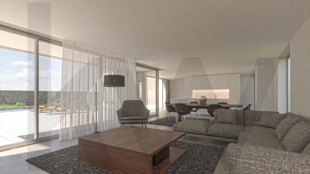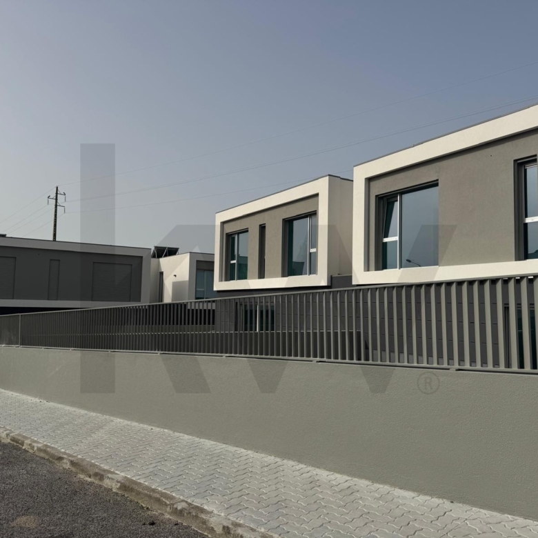 Os detalhes construtivos são de excelência, com revestimento externo com isolamento térmico, capeamento de platibanda com betão pré-moldado, guarda metálica em tubo do tipo RHS e camada de acabamento acrílico mineral. A porta de entrada pivotante e a caixilharia exterior em alumínio reforçam a segurança e o design moderno da casa.