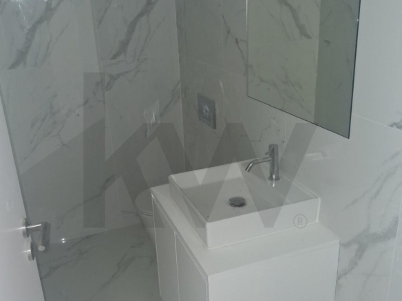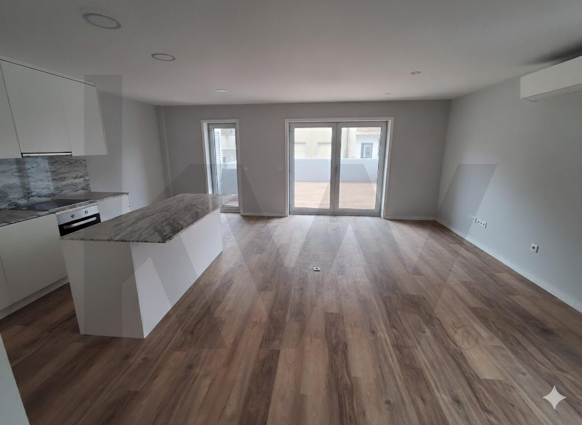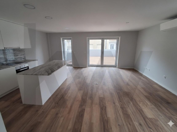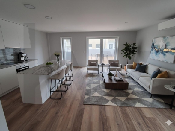 O apartamento apresenta uma moderna cozinha em open space, criando um ambiente amplo e luminoso que integra harmoniosamente os espaços de convívio e refeições, ideal para o estilo de vida contemporâneo. Esta configuração não só maximiza a sensação de espaço como também proporciona maior funcionalidade ao dia a dia, permitindo uma interação natural entre quem cozinha e os restantes ocupantes da casa.