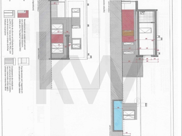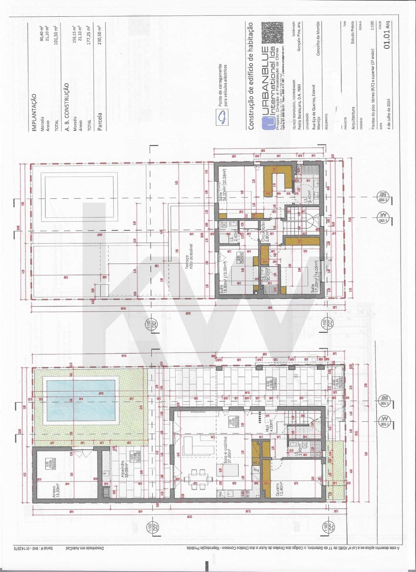 Moradia com : Piso 0 – Sala com cozinha americana, quarto, wc, logradouro e estacionamento; Piso 1 – 1 suite, 2 quartos wc e terraço.