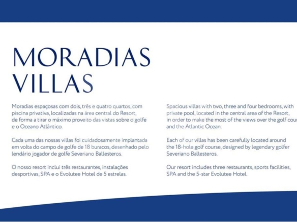 Este Resort dispõe de uma oferta de Terrenos para Construção de Villas exclusivas, com moradias de dois, três e quatro quartos com piscinas privadas com uma arquitetura de design contemporâneo. A sua concessão e o seu desenvolvimento tem como marca evidente o respeito pela natureza e o meio ambiente. Os Terrenos distribuem-se em torno do já prestigiado campo de golfe de 18 buracos e estão estrategicamente colocadas para tirar o máximo partido da deslumbrante vista para o mar. Estrategicamente situados para se misturarem com os pinheiros e urzes da zona, as aldeias residenciais apresentam riachos, pontes, elementos aquáticos, pátios, arcos, ciclovias, jardins escultóricos e vegetação abundante.