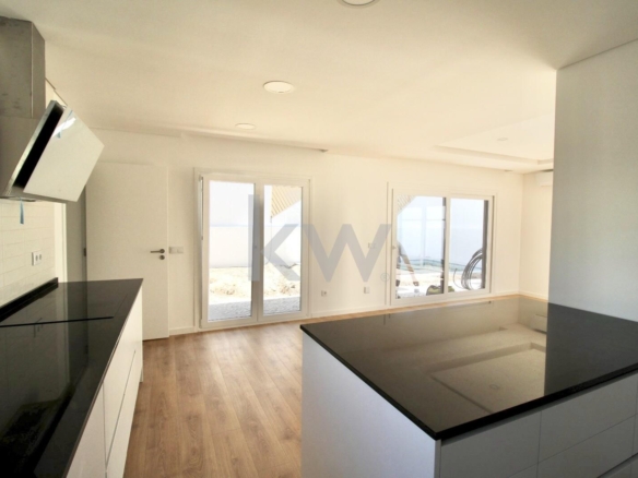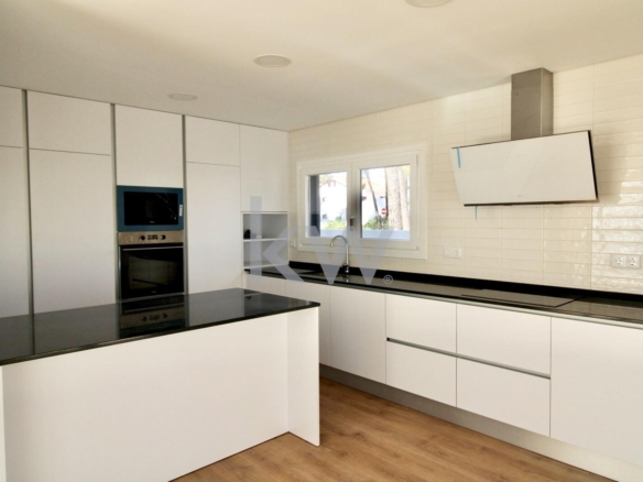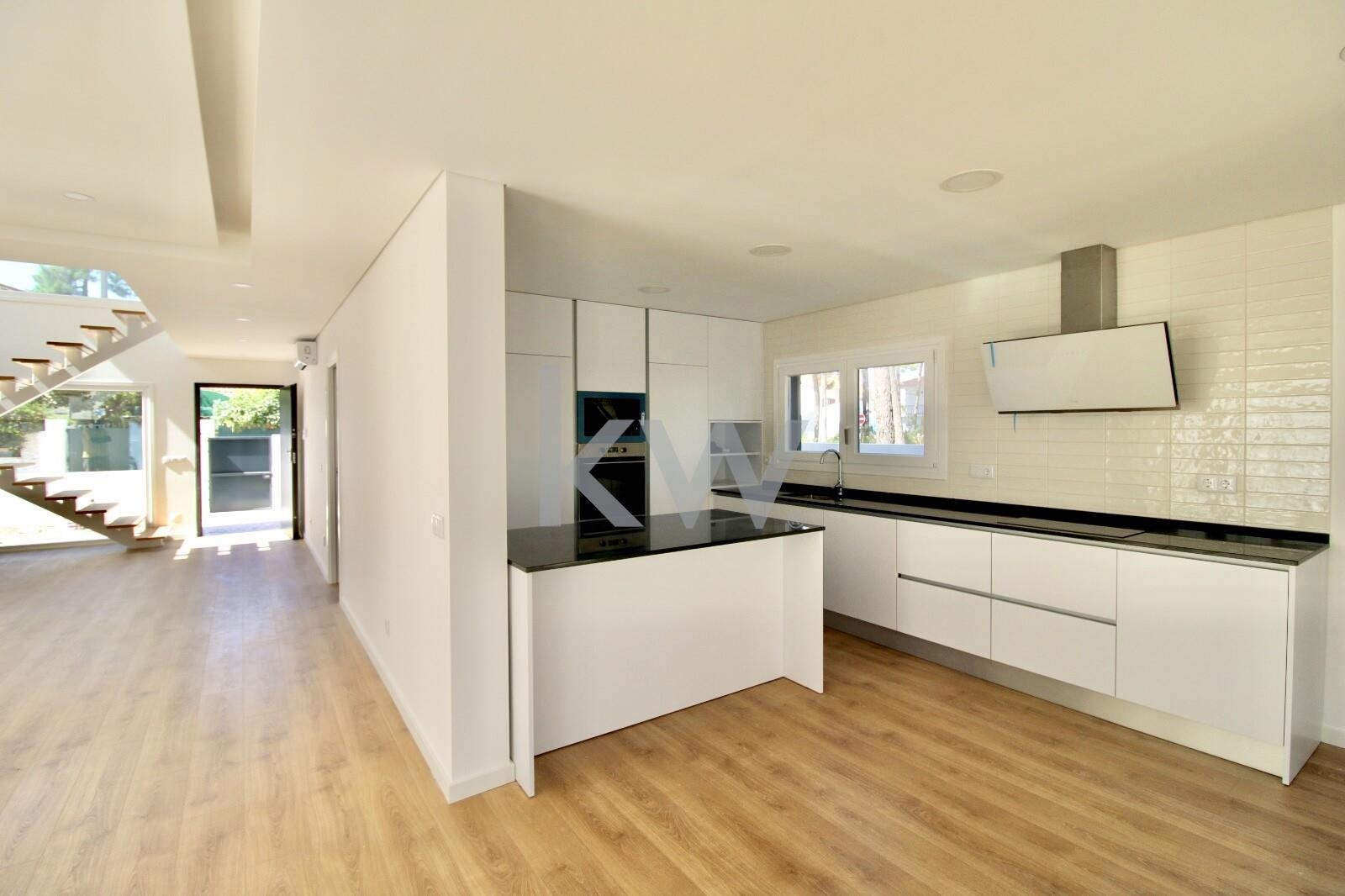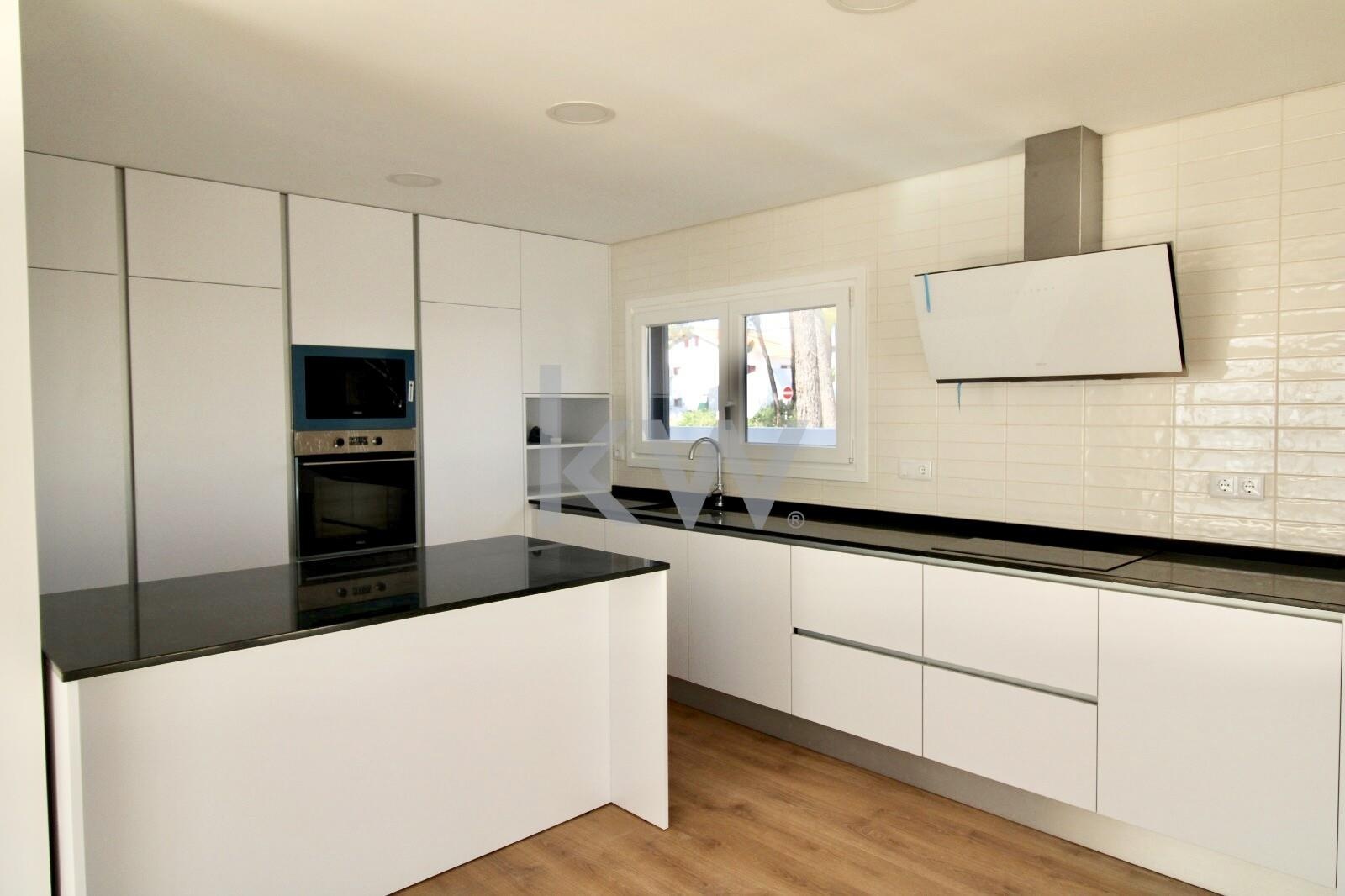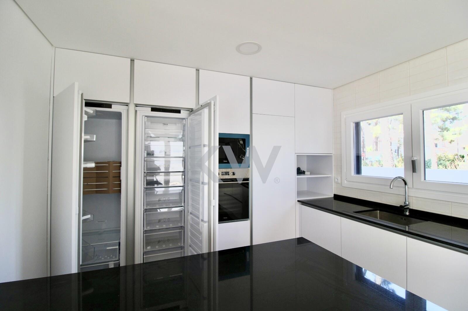 Cozinha Equipada com móveis lacados a branco e eletrodomésticos TEKA (forno, placa, exaustor, frigorífico combinado, máquina de lavar roupa/secar, máquina de lavar loiça e micro-ondas),